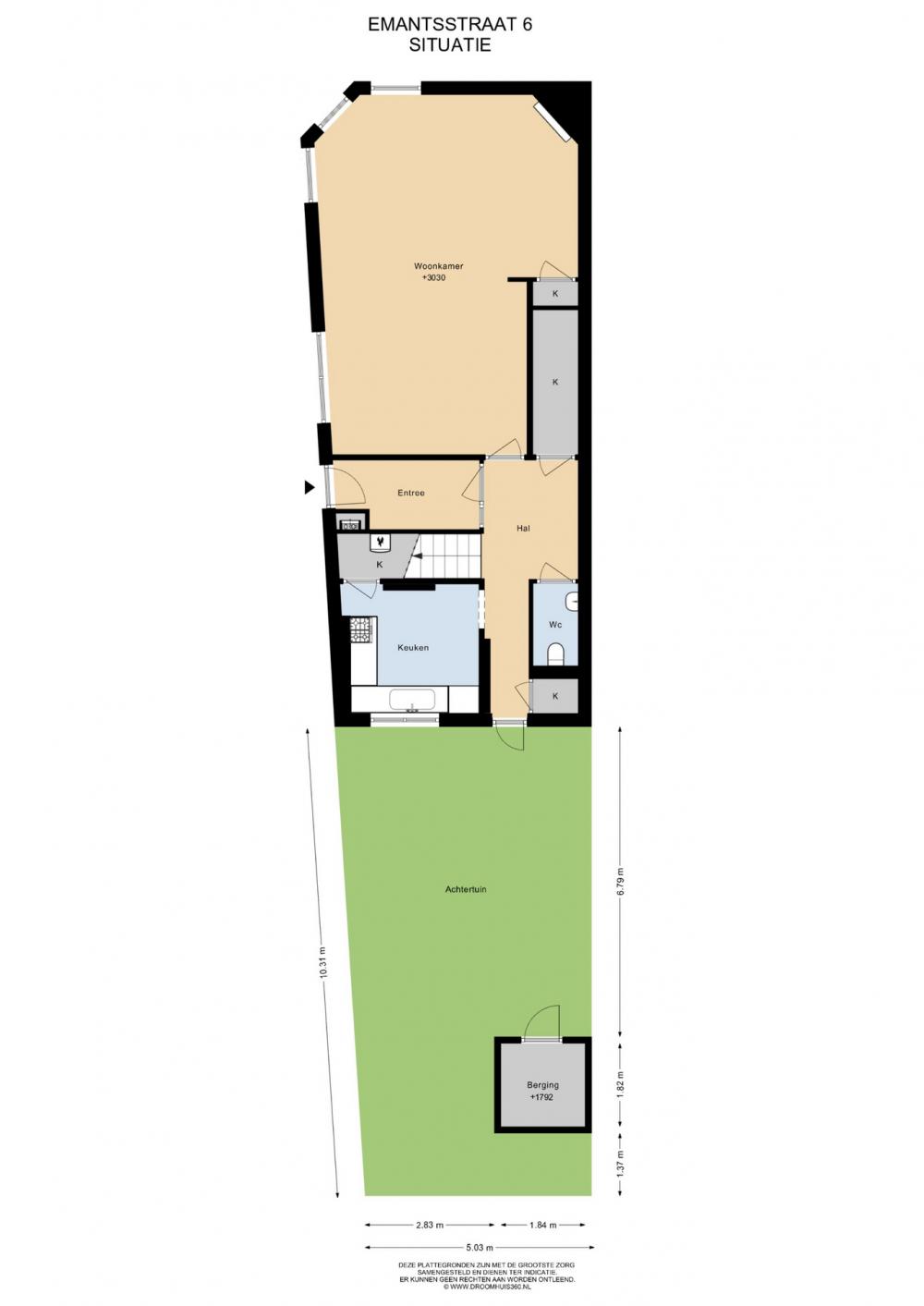 Entrance. Spacious hall with meter cupboard. Hallway with toilet with fountain and deep indoor storage closet and fixed cupboard. Spacious living / dining room at the front with fireplace (not recently used) and closet. Kitchen with appliances and closet with central heating system. From the hallway access to the private northeast facing backyard with stone shed, pond and side entrance.