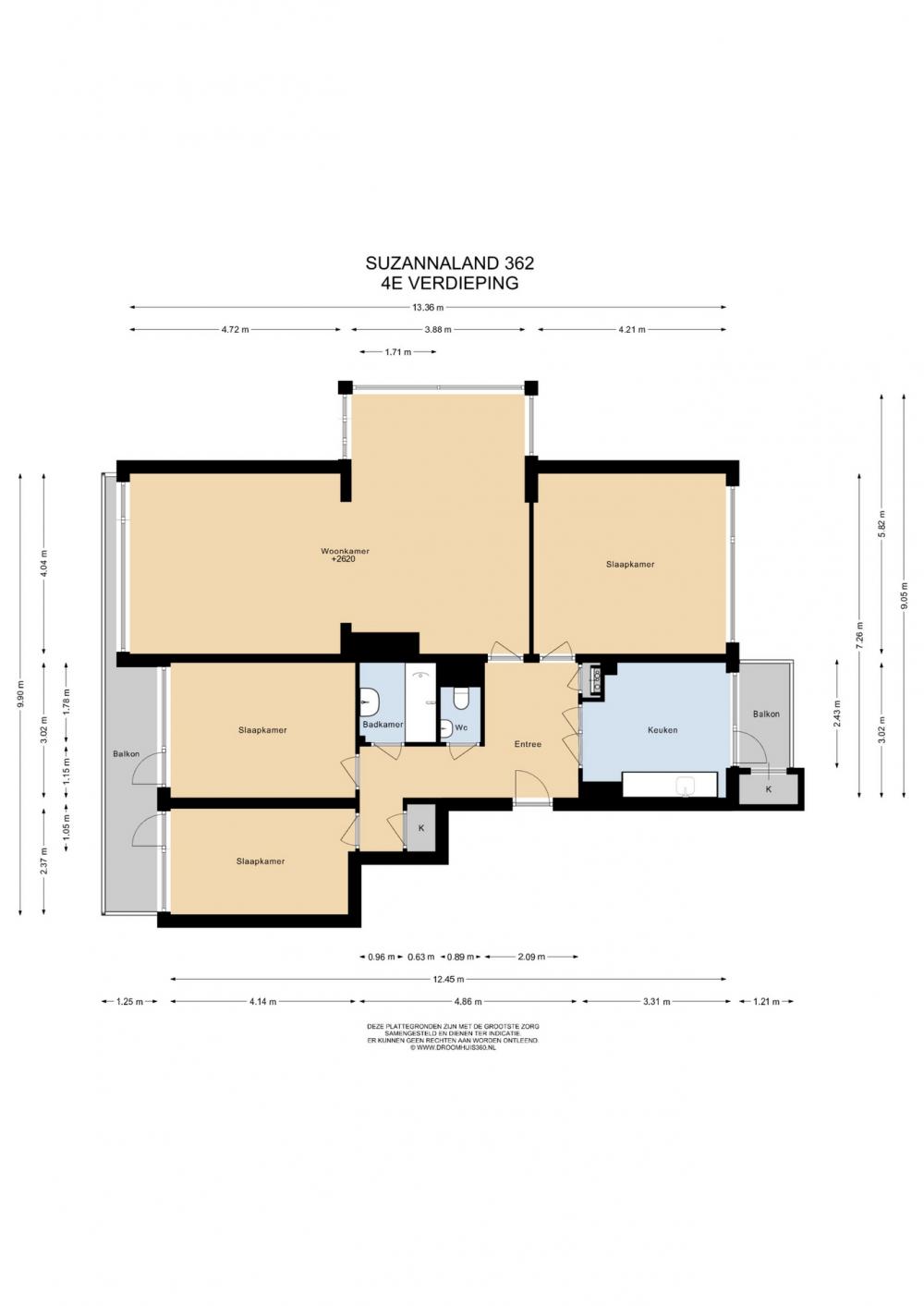 Het appartement bevindt zich op de vierde etage en is bereikbaar met de lift. U komt binnen in een ruime hal die toegang biedt tot de aparte keuken, woonkamer, drie slaapkamers, het separate toilet met fonteintje en de badkamer voorzien van ligbad.